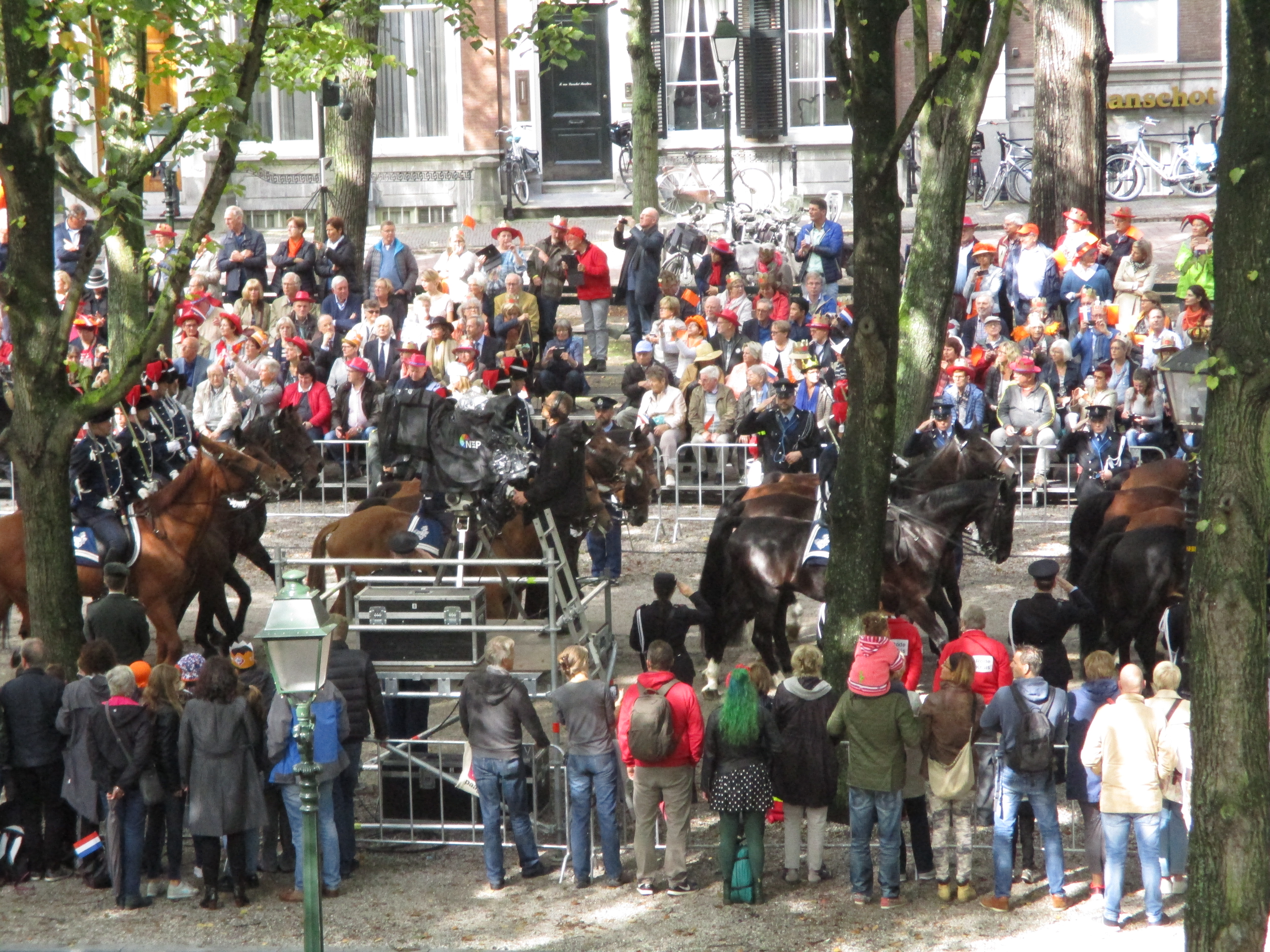 Both the formal address and the short drive over are steeped in protocol and attract various audiences -one suspects- with various motives: primary school pupils and their teachers, royal family enthousiasts, locals, journalists, law enforcement, parliamentarians. Still, there seems to be an overarching importance attached to the observation of protocol and the authenticity thereof. “In terms of ritual, the cognoscente can be pleased, even if this is a day nobody wanted” (“Qua rituelen komt liefhebber niets tekort, maar dit is een Prinsjesdag die niemand wilde” -Volkskrant) headlines a national newspaper, referring to the long wait for a new government following elections last March, yet to be concluded. Meanwhile, one can relish in sighting the king and queen in their 1826 glass carriage, and seeing the Dutch cavalry ride by in traditional dress. One can listen to the voice of the king transmitted from speakers along the route, whilst queueing for french fries, sharing a toast with neighbours, or visiting a make-shift toilet.