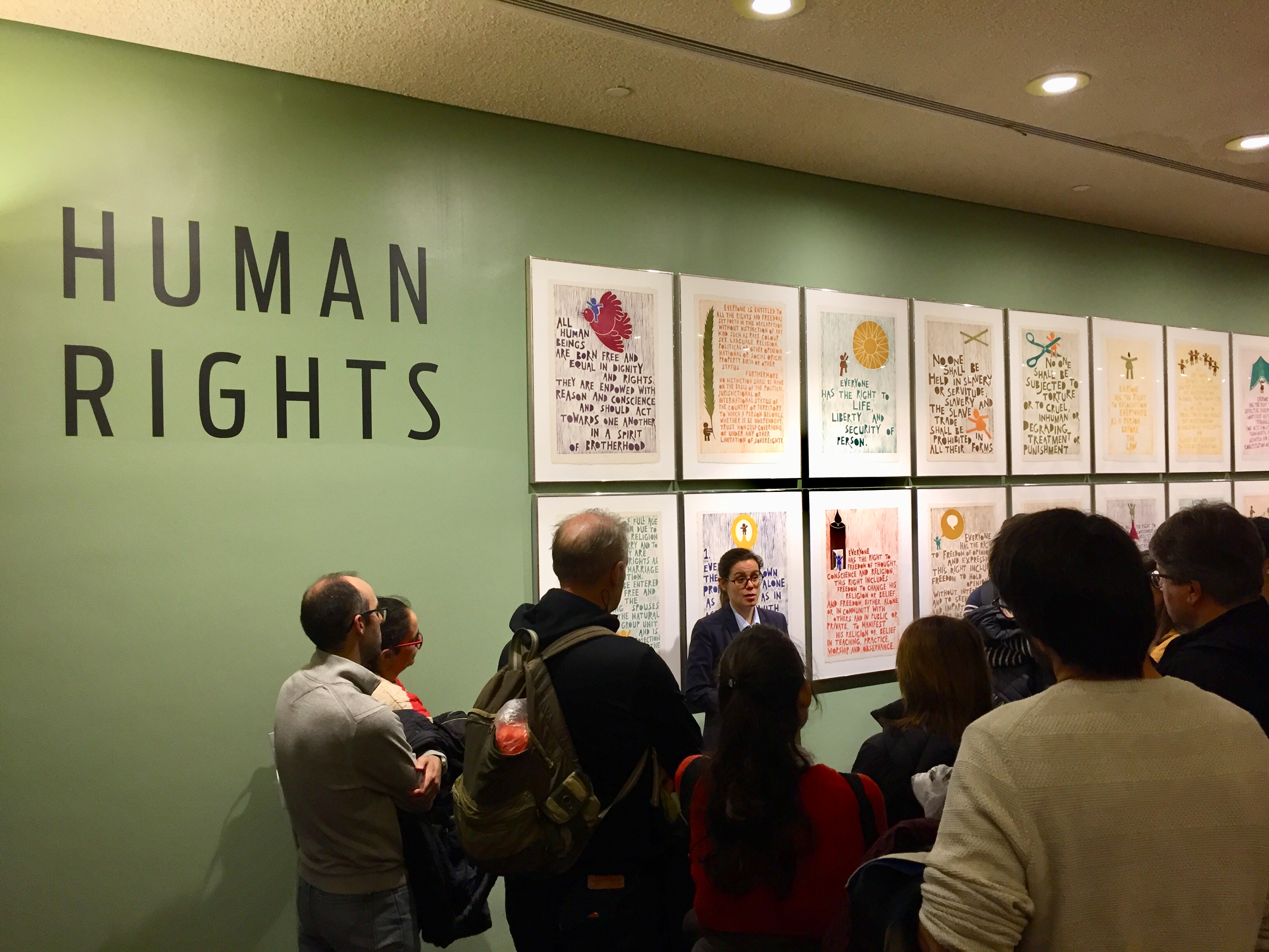 Visitors listening to an explanation by a United Nations tour guide about the Universal Declaration of Human Rights at the UN Headquarters in New York. The Declaration is a milestone document in the history of human rights. It is the first document to set out fundamental human rights to be universally protected.
