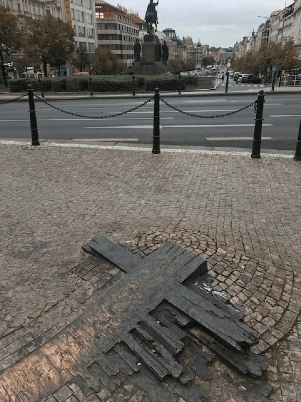 Our sightseeing begins at the elevated part of Prague’s Wenceslas Square, ordinarily a busy hub for tourists and locals alike. Lined with shops, cafés and restaurants, the Square also features, quietly, a very ‘seen’ memorial to Jan Palach and Jan Zajíc. Palach immolated himself here in January 1969 in the aftermath of the occupation of Prague by Soviet forces a year earlier. In February 1969 at a memorial service to Palach after the StB had exhumed and cremated Palach’s body, Zajíc also tried to immolate himself, but died from the acid he drank shortly beforehand (Zajíc did not want to suffer great pain like Palach—who succumbed three long days after he had set himself on fire). Palach’s memorial takes the form of an undulating bronze cross embedded in the cobblestones—woven into the very fabric of the square and rippling gently.
