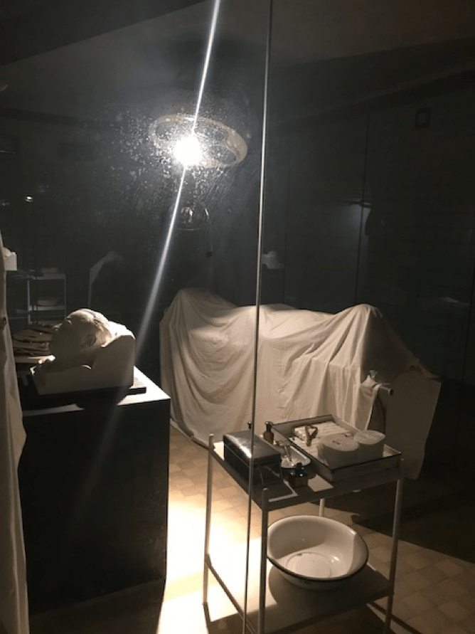 And how was Gottwald’s mausoleum refurbished? The authorities did not engage in cancel culture, nor remove and shuffle, nor topple. Instead, they opted for retentionism coupled with the inclusion of new information. So, several plaques have been put up in an antechamber. These describe the man, his background, his death, the times at the time, and the construction of the mausoleum. These plaques describe the man as he was, namely, in unflattering terms. No mention is made of any achievement. As visitors enter the space, and wend and wind through the short corridors, they encounter decals that have been affixed to the walls and floors of the mausoleum and its entry points. Many of these are intentionally placed on angles, which furthers the attraction of the public’s gaze and creates a sense of imbalance. These blare out ‘facts’—’21.499 sentenced to forced labour camps’, ‘2.3000.0000 people were persecuted’, as examples. In the middle of the room is an apparent fake corpse, draped with a white sheet, on an elevated hospital stretcher, in a big glass box. Inside the box, in addition to a seeming corpse, is medical equipment, an army coat, bandages and gauzes, slippers, a wreath of red roses—plastic or chemically preserved—with a star on their lower right. Evidence of embalming, no doubt, and some of the personal details left behind. On a further short diagonal from there, in the corner, lies a traditional grave stone memorial.