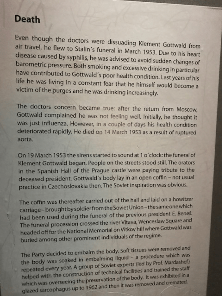 As for Gottwald, well, he died young, in his fifties, in 1953. The fashion at the time was for Communists to embalm, mummify (without sheets), and display their leaders. Gottwald was no exception. An elaborate chemical, medical, and mechanical system was established to attempt this ambition. A crypt (his crypt) was dug deep beneath Prague’s National Memorial on Vítkov Hill, originally built between 1928-1938 to honor the Czechoslovak legionaries during the First World War. The tomb of the unknown soldier erected after the Second World War also lies within the National Memorial, as well as a huge horseback statue of Jan Žižka that commemorates the one-eyed military leader from medieval times. The external walls contain attractive murals depicting Czech military history which end on a decidedly Soviet note with flowers, friendship, and liberating tanks embossed into thick metal doors.