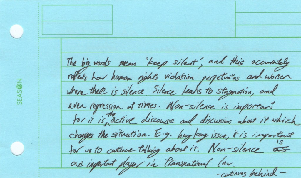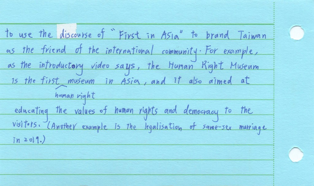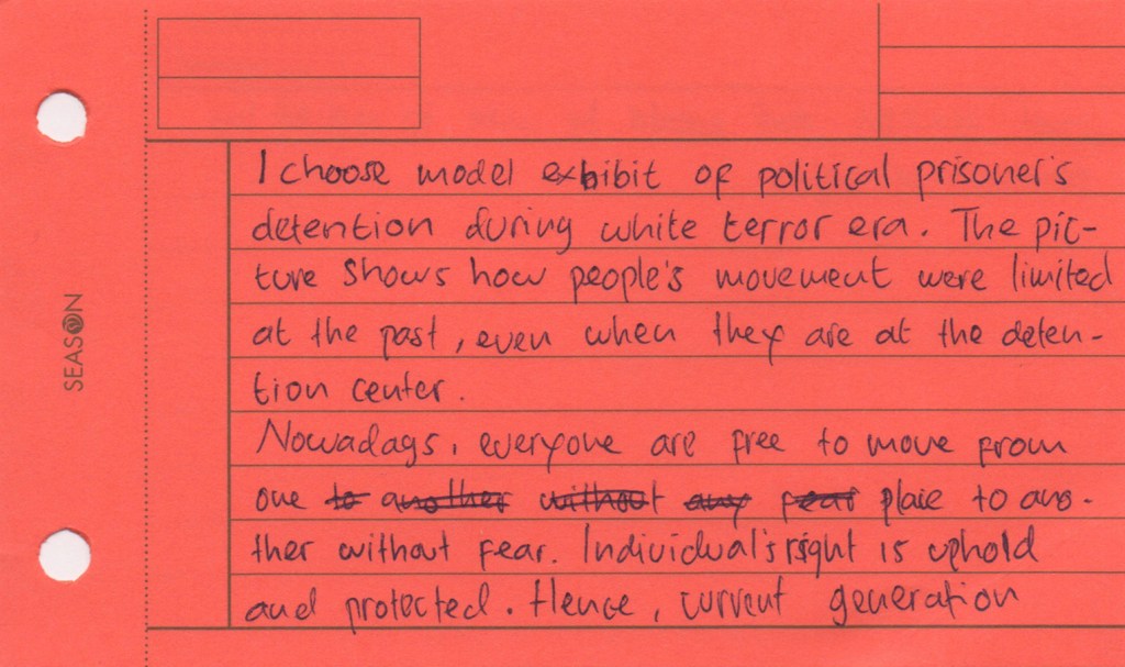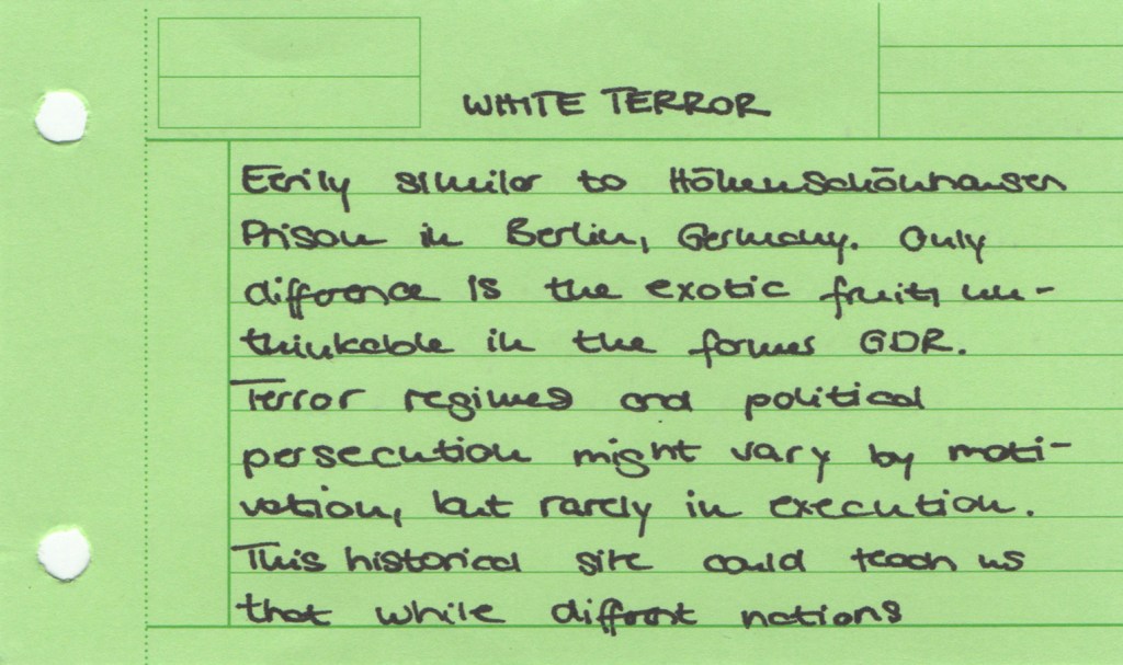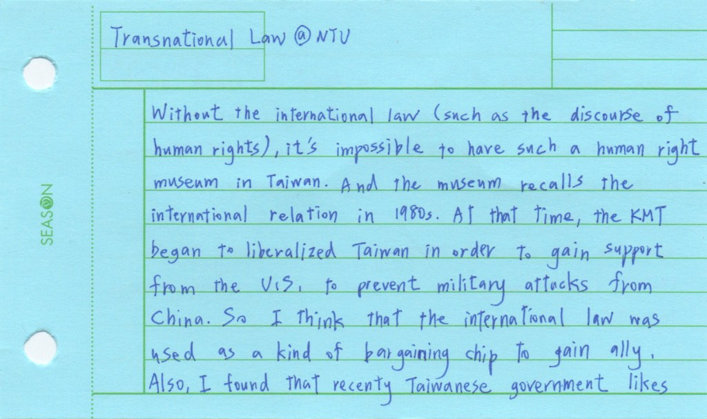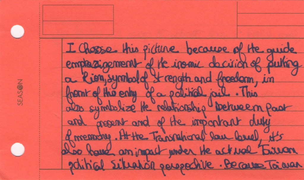 The Jing-Mei White Terror Memorial Park and its accompanying National Human Rights Museum in Taipei are the site of the former Xindian military prison and military court for political dissidents in use during the period of “White Terror”, which marked Taiwan for over 40 years and lasted until the early 1990s. We visited this former prison now turned museum as part of the course Transnational Law taught at National Taiwan University (NTU). As a class we set out to see how we could connect the story of the museum to the theme of our course: would it be possible to view this museum as a transnational legal actor of sorts? The brief was to look around, to see what would stand out, to notice details. Students were asked to take photographs during the tour, and to select one photo that they felt captured their visit and that they would discuss afterwards. Following the discussion, they wrote down their thoughts in a short reflection, producing a postcard to accompany their picture. We posed a sequence of three questions: what do you see in the photograph; what does that mean to you; how can you connect this to transnational law?