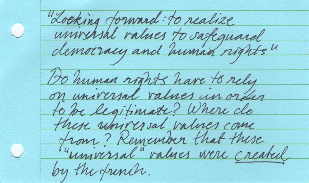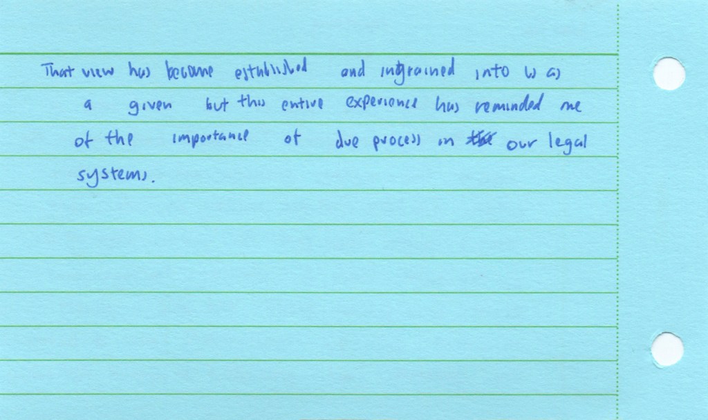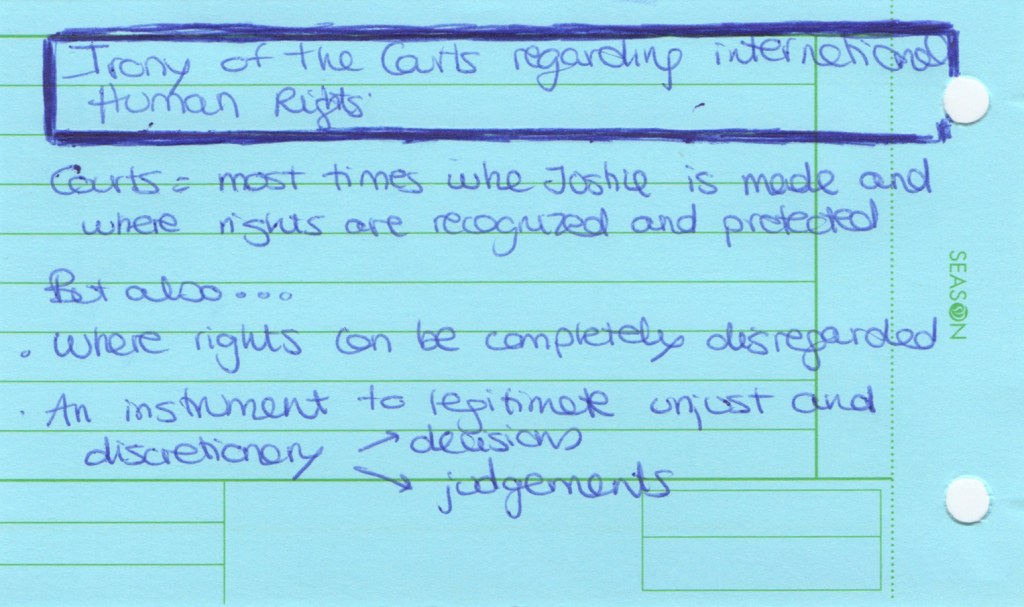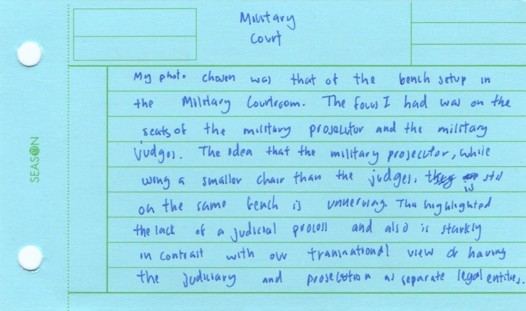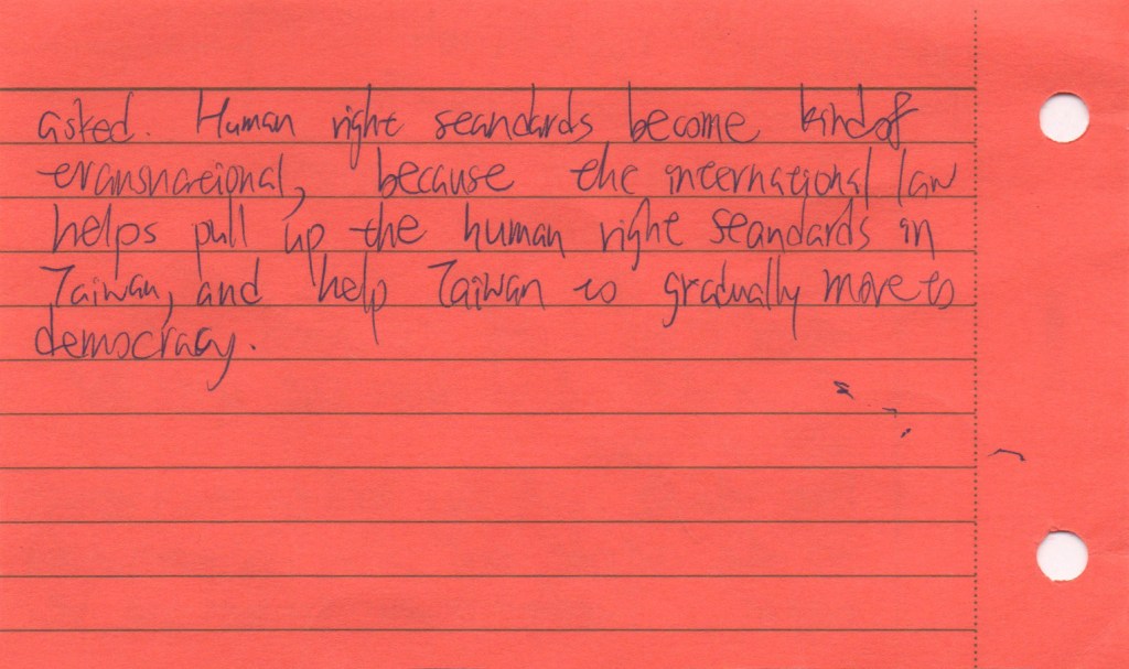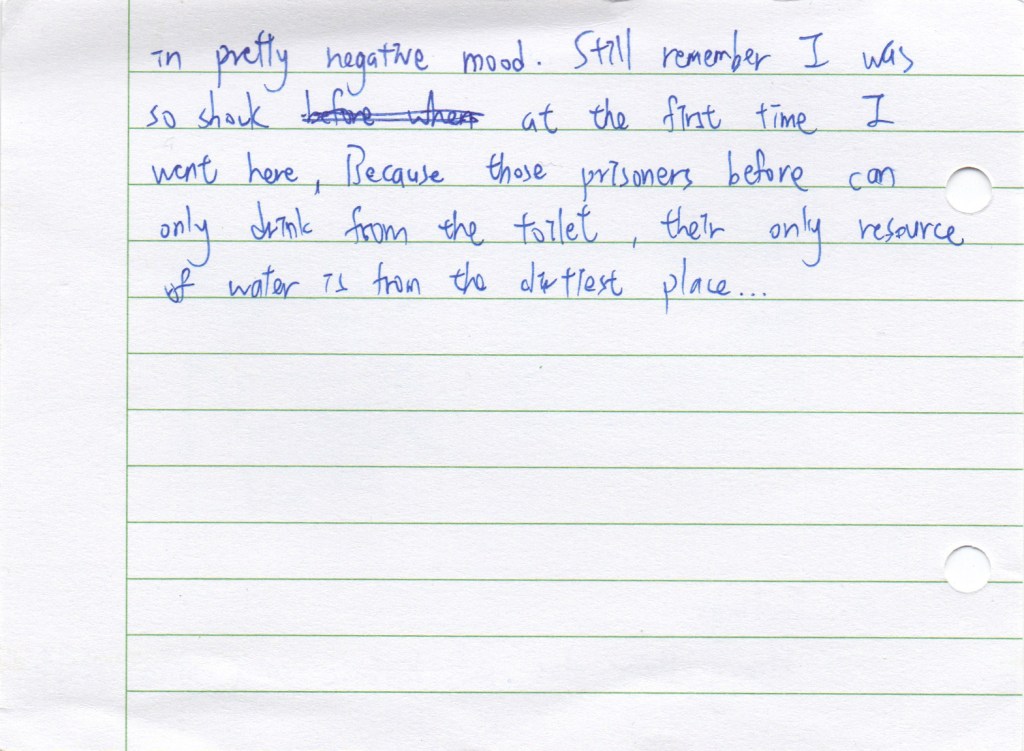 The Jing-Mei White Terror Memorial Park and its accompanying National Human Rights Museum in Taipei are the site of the former Xindian military prison and military court for political dissidents in use during the period of “White Terror”, which marked Taiwan for over 40 years and lasted until the early 1990s. We visited this former prison now turned museum as part of the course Transnational Law taught at National Taiwan University (NTU). As a class we set out to see how we could connect the story of the museum to the theme of our course: would it be possible to view this museum as a transnational legal actor of sorts? The brief was to look around, to see what would stand out, to notice details. Students were asked to take photographs during the tour, and to select one photo that they felt captured their visit and that they would discuss afterwards. Following the discussion, they wrote down their thoughts in a short reflection, producing a postcard to accompany their picture. We posed a sequence of three questions: what do you see in the photograph; what does that mean to you; how can you connect this to transnational law?