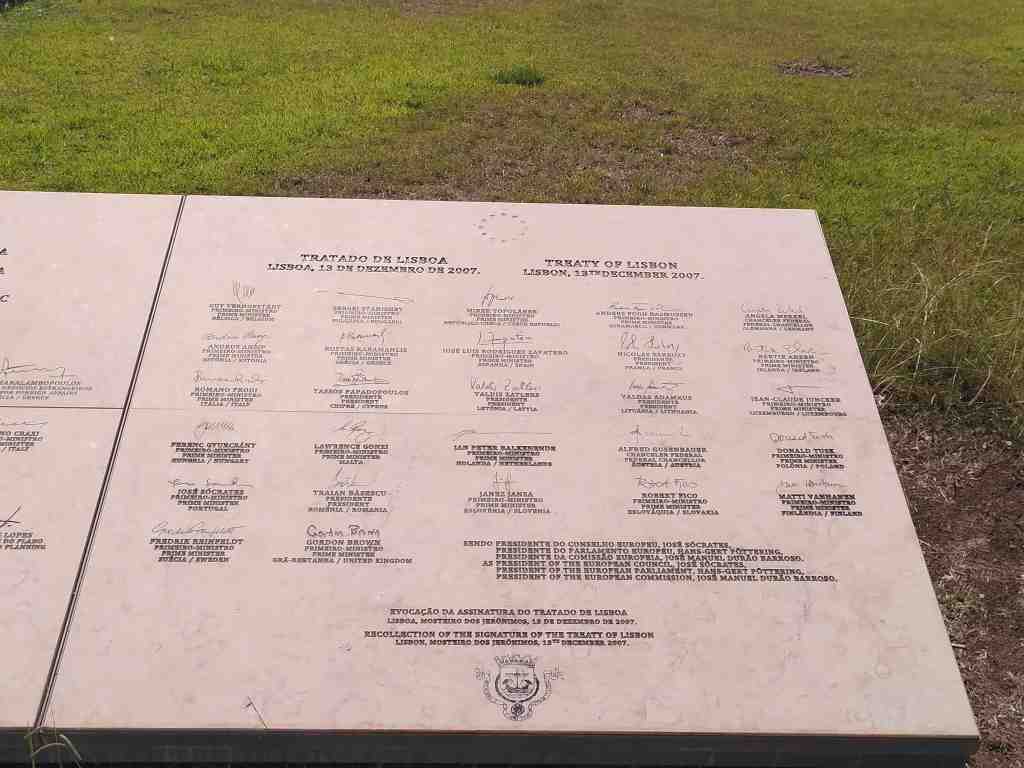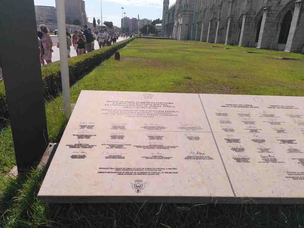 If they wouldn’t be rushed up by security personnel they might in fact have a chance to study the depiction of the signatories of the Portuguese Accession Treaty and the Treaty of Lisbon, which are displayed brotherly side by side. In fact, the monastery was the place where on 12 June 1985 the ceremony took place marking the Portuguese singing of the Treaty of Accession to the European Communities, including a speech by Commission president Jacques Delors. More than 22 years later, the courtyard of the monastery would also be the place where the Treaty of Lisbon was signed (13 December 2007).
