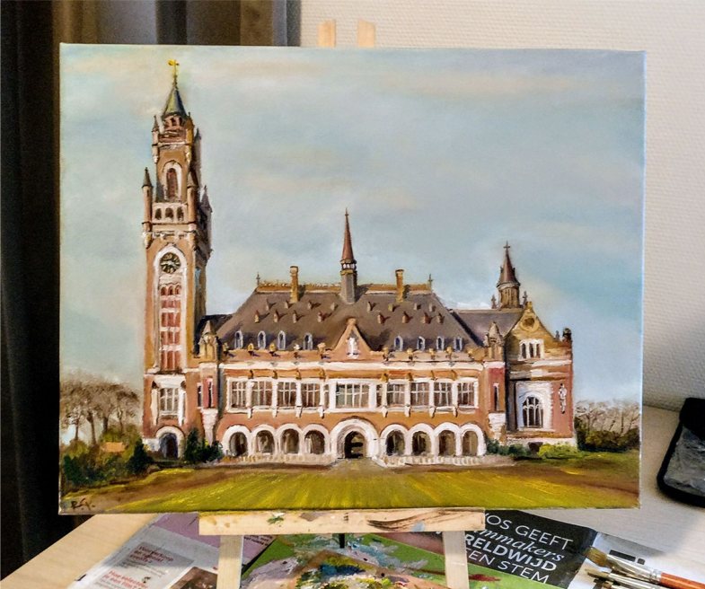 Mumbling something under his breath, Rashid, as usual, was enthusiastically painting another masterpiece, blanketing himself and our floor with numerous colorful art supplies. His inspirations were spontaneous but vivid – from the loved and hated post-Soviet architecture of Central Asian cities to the works of the greatest artists. This time, passing by his next chefs-d’oeuvre, I glanced briefly and froze in shock. The sketch, not even a painting yet, was already very recognizable to me: a familiar building, every curve and window of which I would voraciously memorize in my public international law courses back in Kyrgyzstan. No, it was not homework, it was a pure religion I was eager to convert to in spite of being geographically and normatively distanced from. The International Court of Justice. I took Rashid on court hopping (like bar hopping, but for lawyers) in The Hague in the first month we arrived in the Netherlands in 2017.