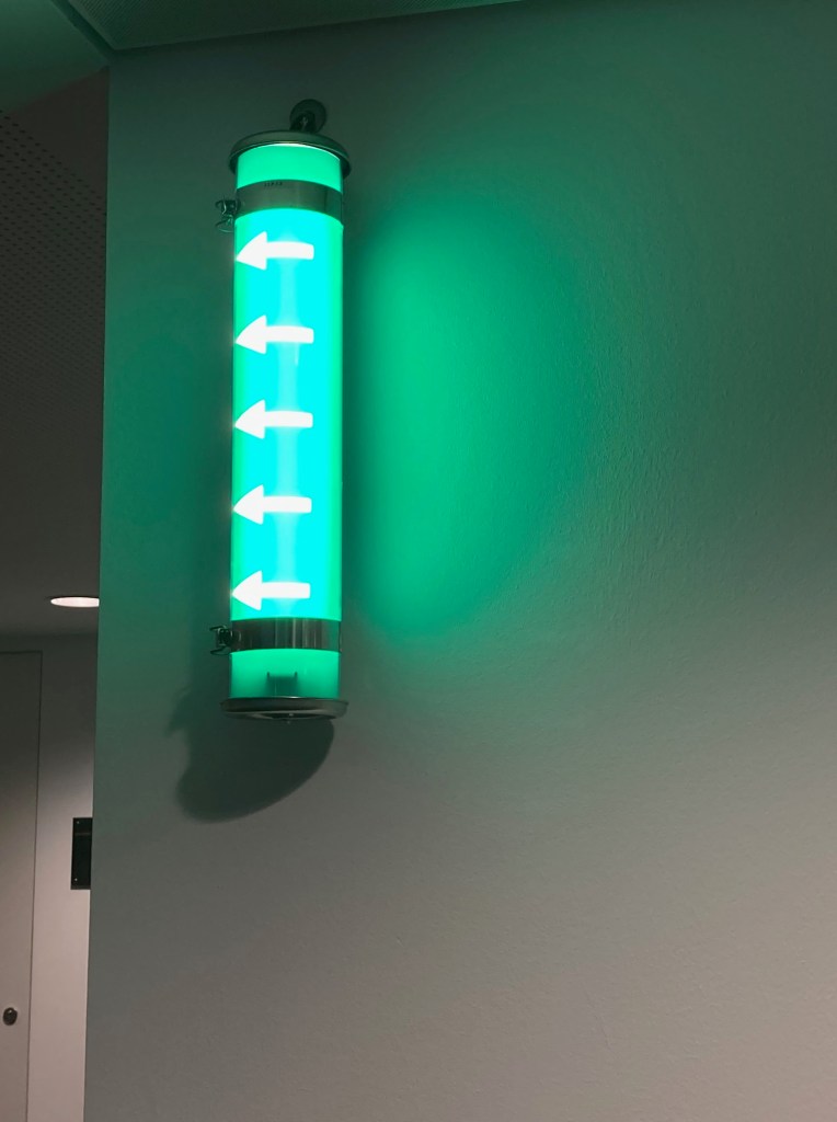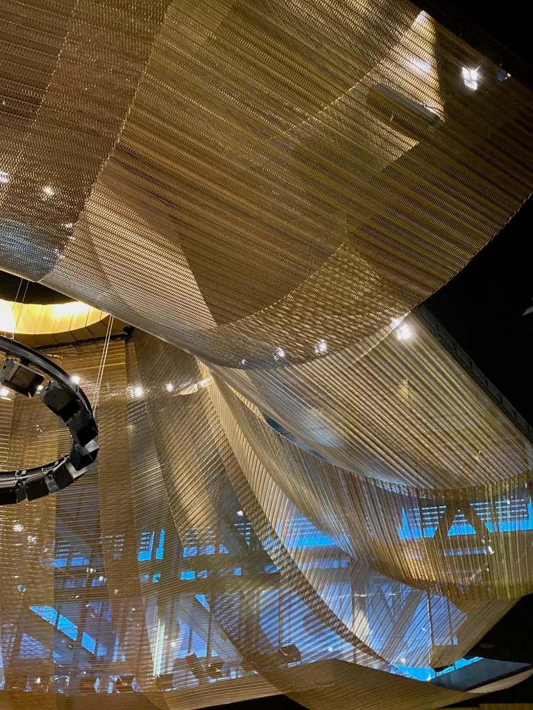 The coal mines and steel factories of Europe are the theme that string the fifth extension of the Curia together. It comes out in 263 Venetian Moreno-glass lamps, made after the lights used in the mines, speckled with gold dust, assembled in an infinity loop floating above the entrance hall. It speaks from the exposed black-matted steel structure, from the choice of signposting throughout the building, and then there is the mesh.