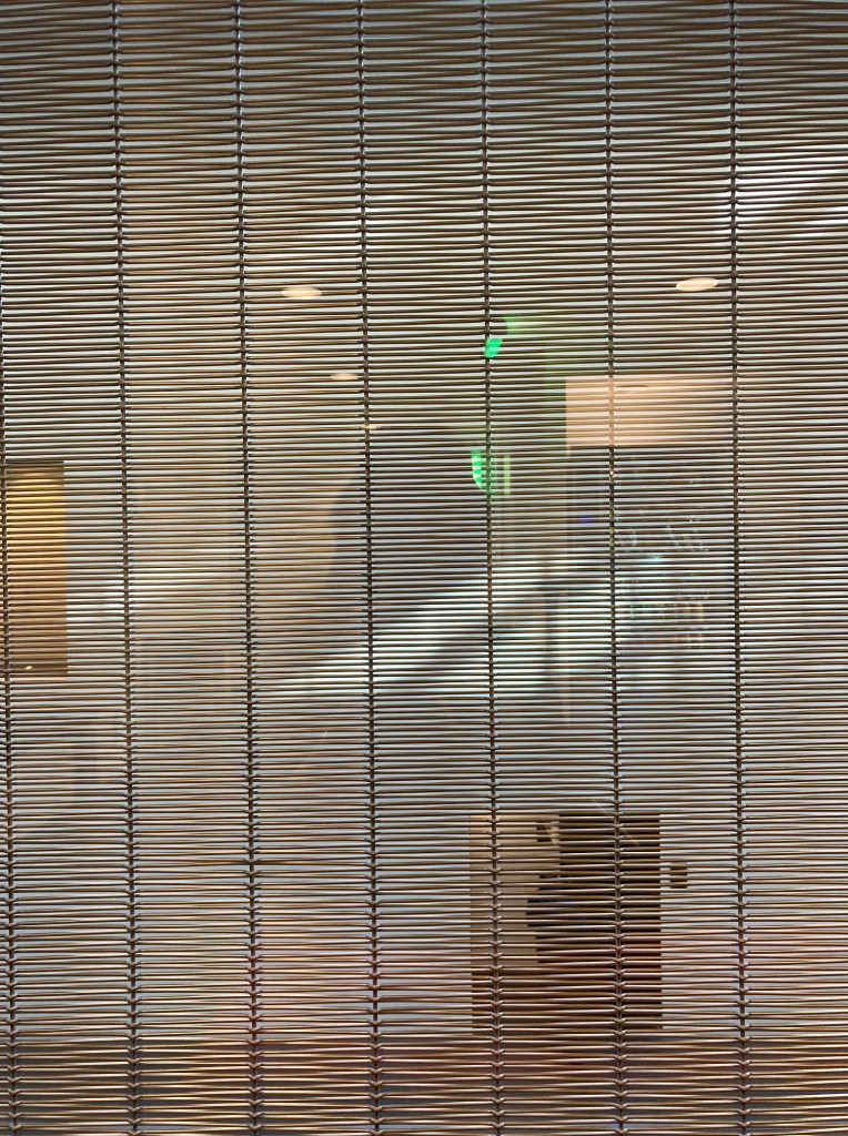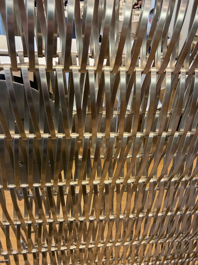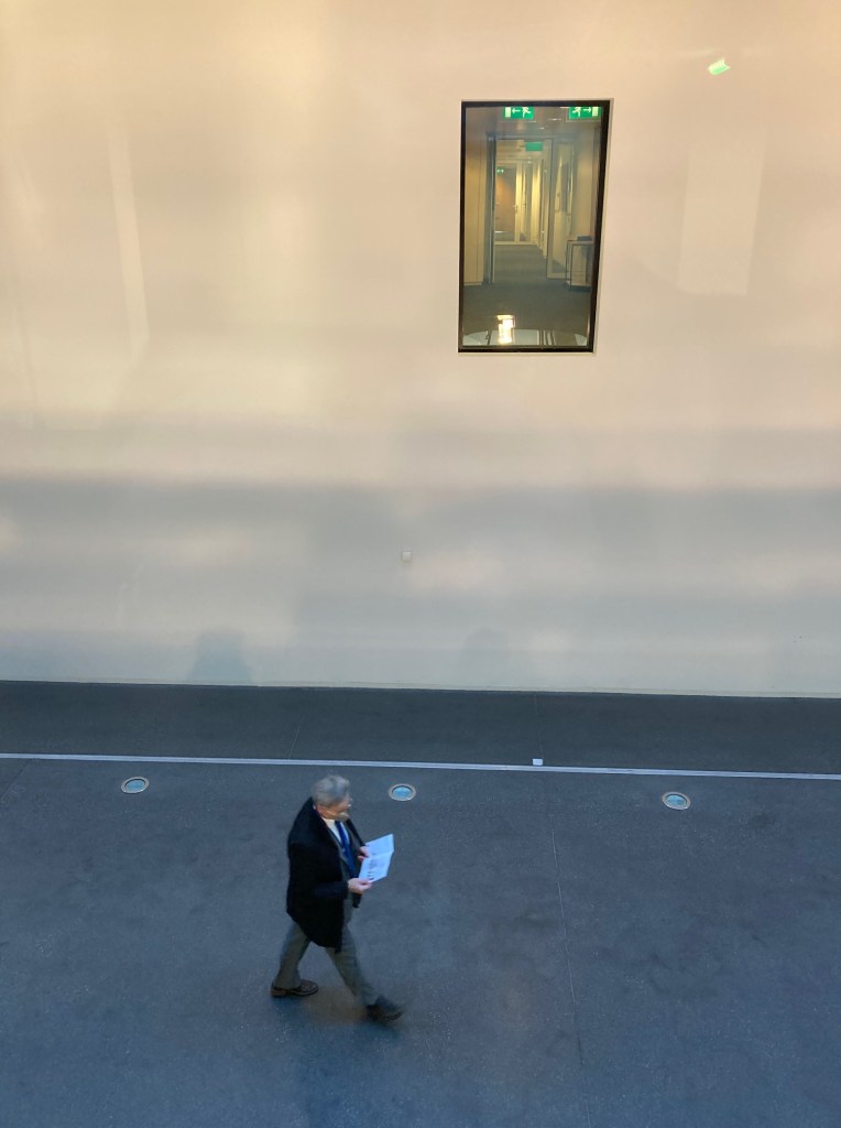It is most obvious in the great baldachin above the main courtroom. Yet then it is also not. Because the total seems like a great curtain, or a circus tent, a flowing bell-shaped dome, perhaps a lantern. It is a mesh of the kind used to prevent damage from avalanches in Italy. It is there to show handwork. It is also there to block views in from the outside, and out from within, so as not to distract from proceedings and at the same time to allow for daylight in. Daylight being an unusual feature for courtrooms, actually. Then all through the building this mesh recurs in various guises. Fine like a knight’s hauberk and crude as on a construction site. Dominque Perrault Architects has patented the technique. In the Curia there is cladding for entrances, as screens in meeting rooms, and even as room divider in the canteen.