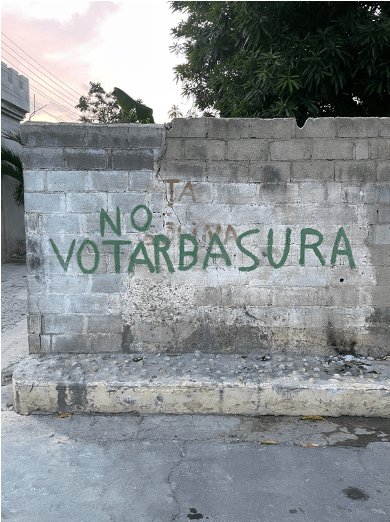 This leads to the second image, and returns us to the failed promise of ALBA. The graffiti on a collapsing wall contains two meanings in one, an experience of indeterminacy. With rubbish bags lying in the street around and no municipal sanitation service, residents have taken to spraying ‘Do not dump rubbish’ around the village. This, in itself, could be comment enough on the state of the nation.