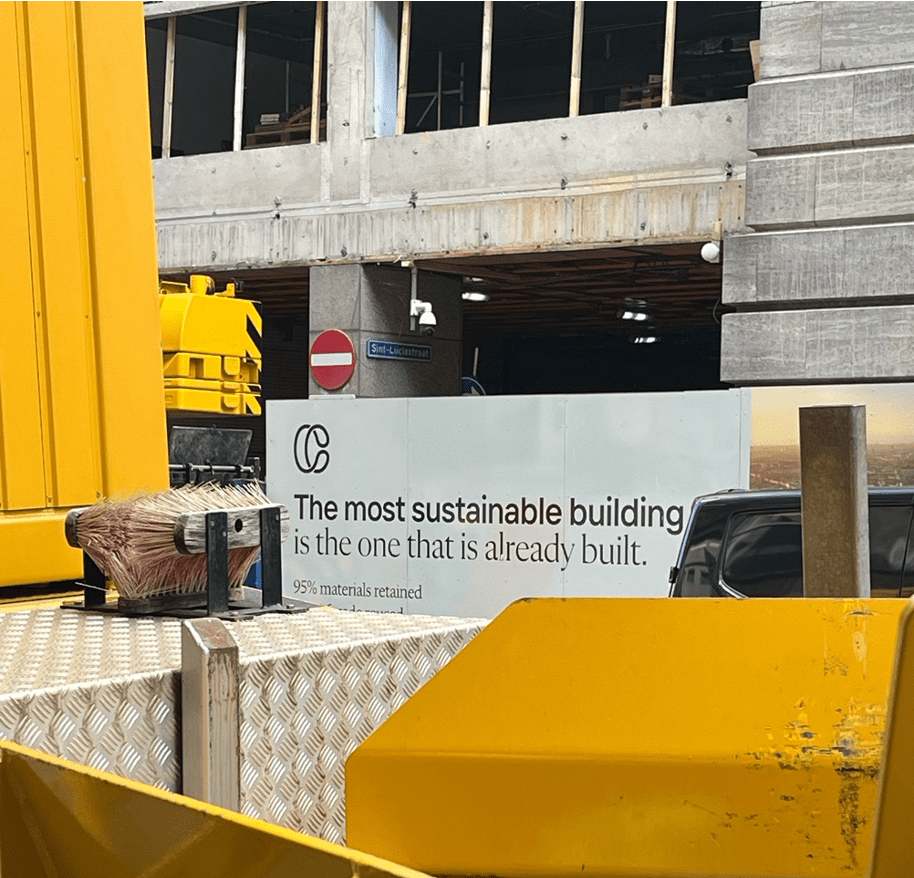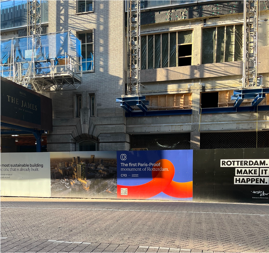 Ever since Stefano Boeri’s Bosco Verticale building in Milan, the world of urban architecture has been taken over by the so-called vertical forest trend. Simply put, this practice consists of including plants and trees in the construction of high-rises. In the Netherlands this trend has manifested itself in Utrecht (Wonderwoods), Eindhoven (Trudo Toren), and Amsterdam (Valley). A recent addition to this trend is planned to rise up in Rotterdam: Tree House. The environmental benefits of these green buildings have not been without scrutiny. But at least they look green! The Architecture firm behind the Valley, MVRDV, even composed an exhibition ‘Carbon Confessions’ where they contemplate their own contribution to the climate crisis. Part of this exhibition was an event called ‘Don’t keep building, keep THE building’. Interestingly, a similar statement is made on the construction façade of C93: ‘The most sustainable building is the one that is already built.’